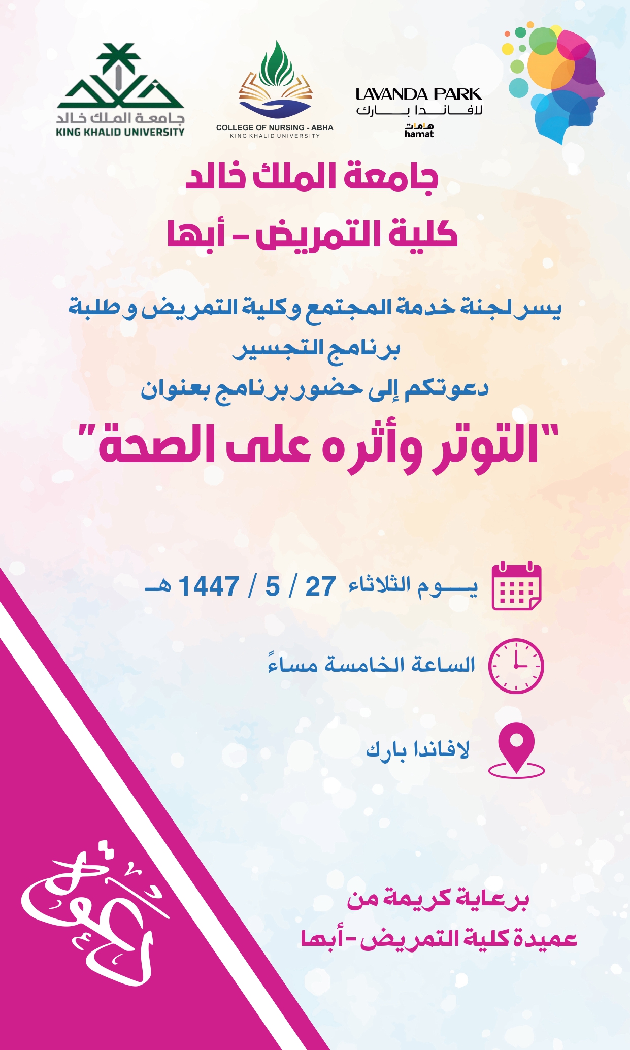 تحت رعاية عميدة الكلية الدكتورة / سحر رفدان الشهراني وبالتعاون مع لجنة خدمة المجتمع وبمشاركة طلاب وطالبات البرنامج التجسيري للتمريض، تم تفعيل برنامج التوتر وتأثيره علي الصحة في لافاندا بارك حبث تناول البرنامج مفهوم التوتر، أسبابه، مؤشراته، وطرائق التعامل معه بفعالية، وذلك بهدف نشر الوعي وتعزيز القدرة على إدارة الضغوط اليومية لدي فئات المجتمع المختلفة.