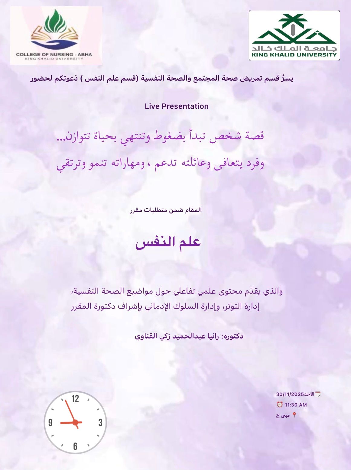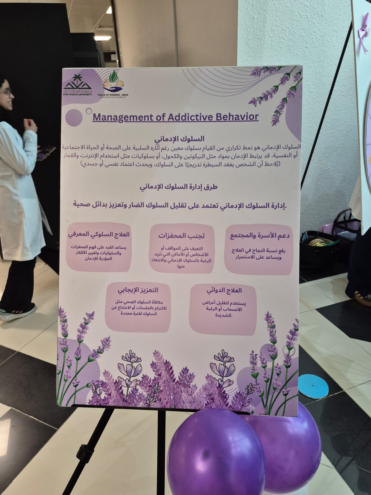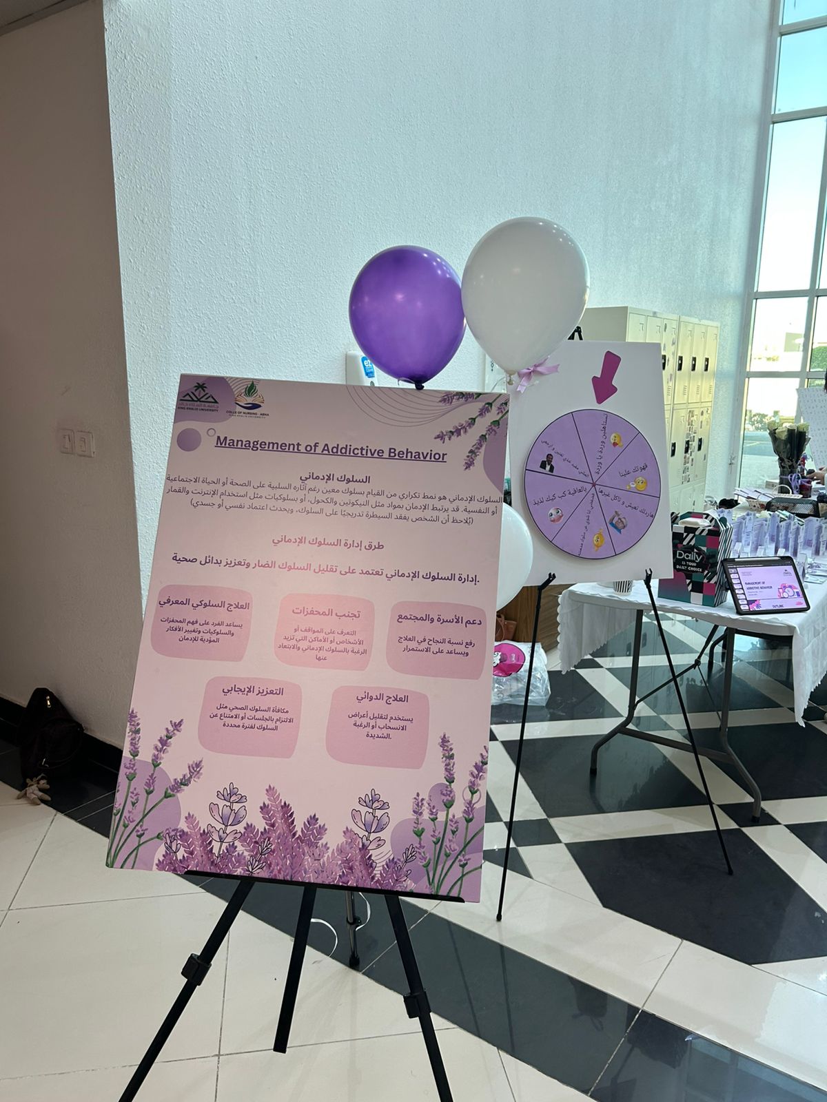 تحت رعاية عميدة الكلية الدكتورة / سحر رفدان الشهراني و بمشاركة قسم تمريض الصحة النفسية والعقلية، تم تفعيل برنامج كيفية التعامل مع الضغوط النفسية والسلوكيات الادمانية.