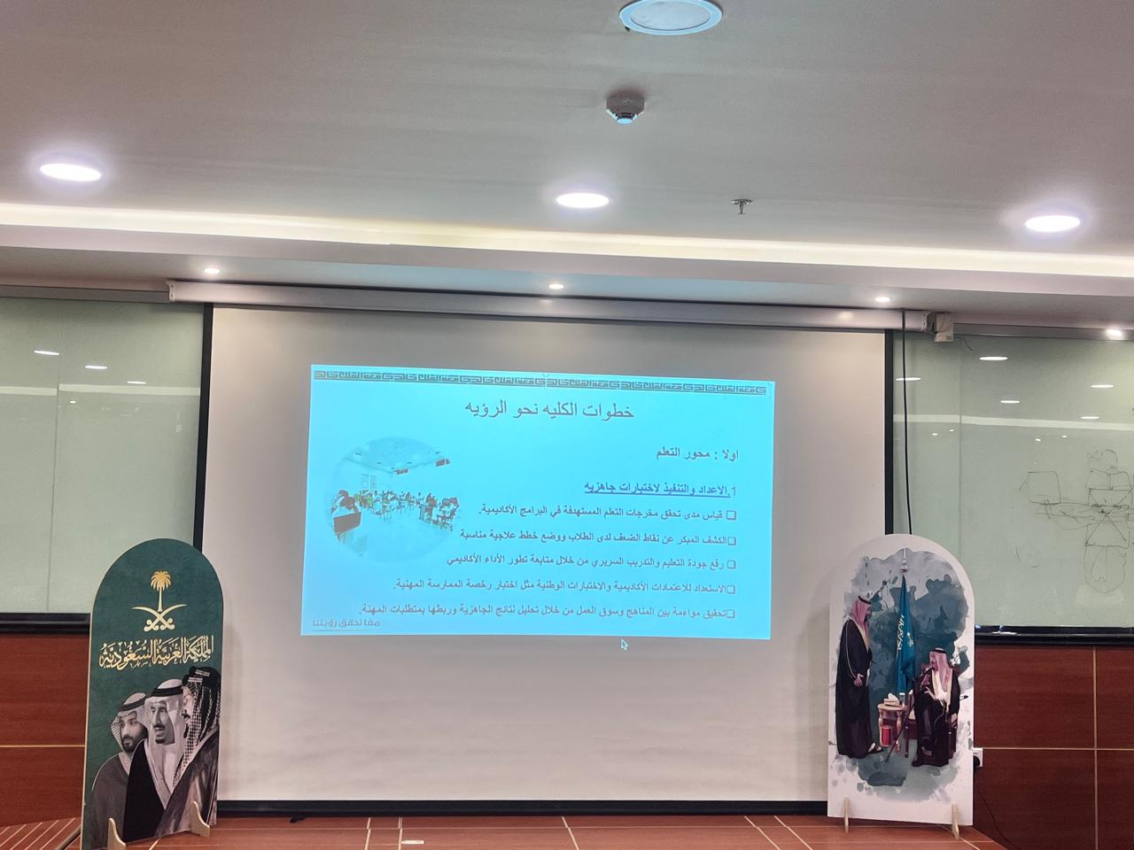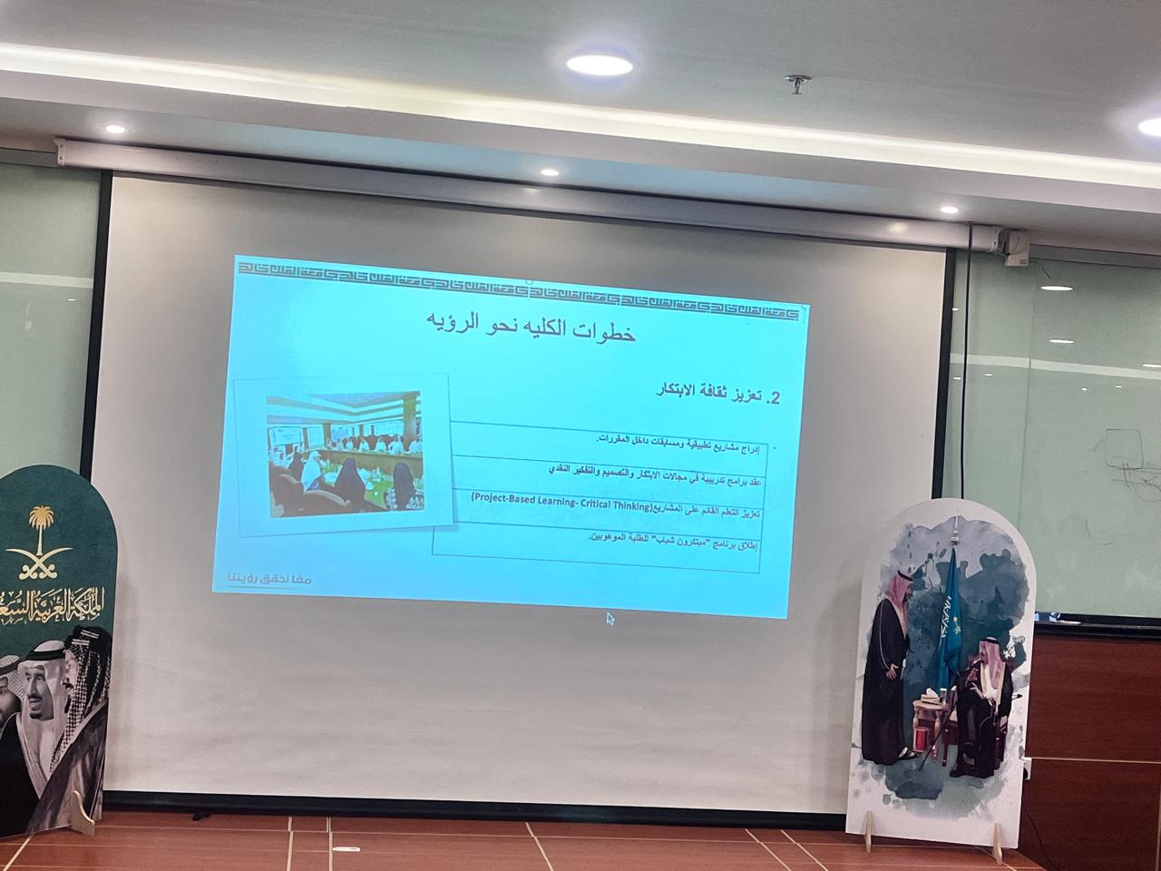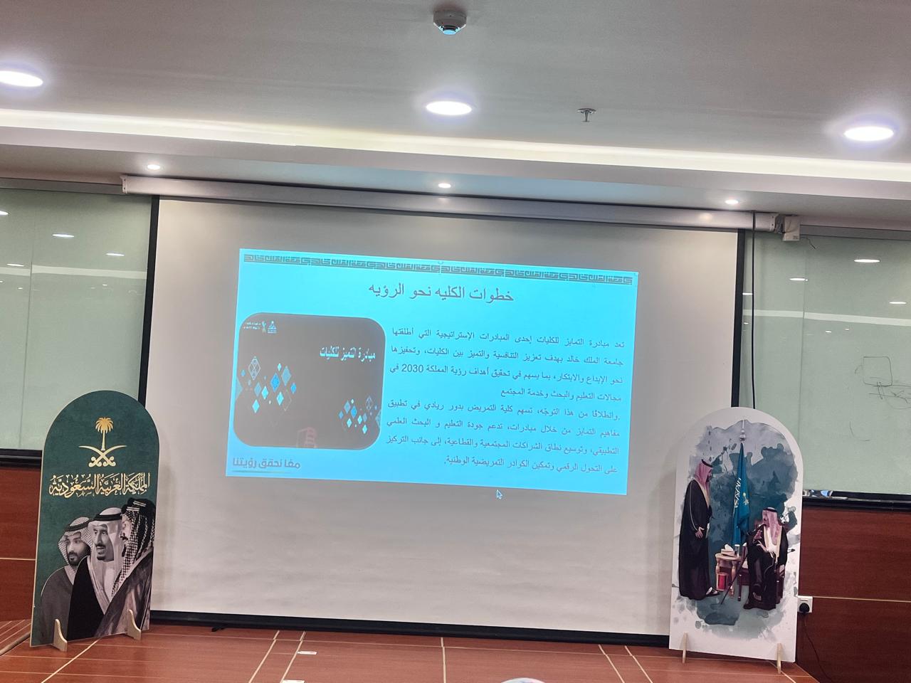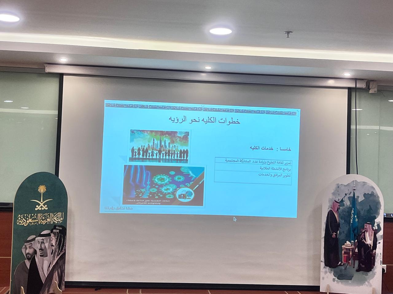 Under the patronage of the Dean of the College, Dr. Sahar Rafdan Al-Shahrani, and the esteemed Vice Dean, Dr. Reem Humaidi, a meeting was held for the faculty members and administrative staff of the college to raise awareness about the Kingdom of Saudi Arabia's Vision 2030.