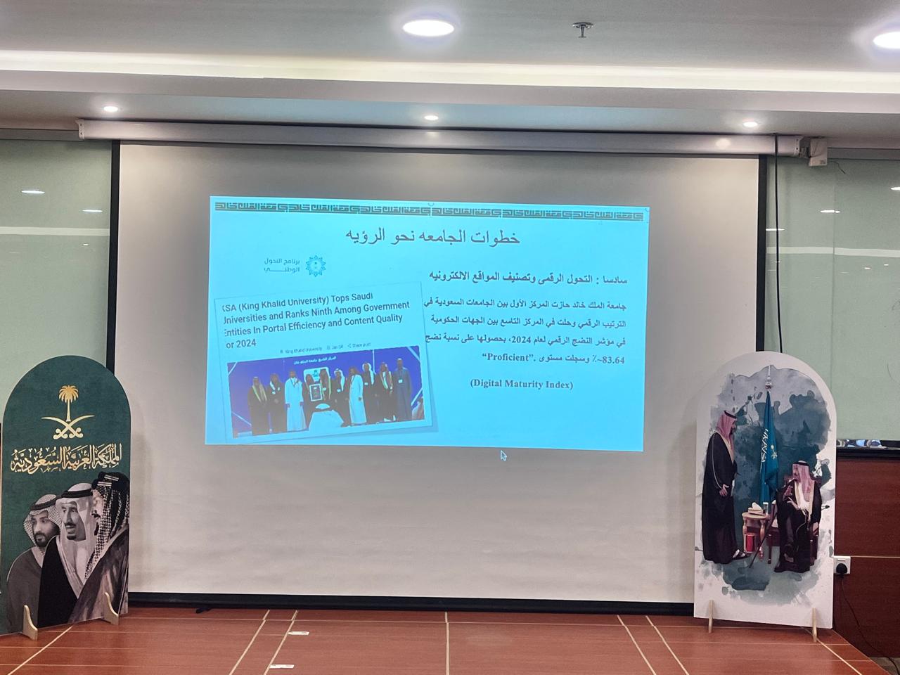 Dr. Sahar Rafdan spoke about the role of King Khalid University as an active partner in achieving the pillars of Saudi Vision 2030 through enhancing the quality of education, developing human capabilities, supporting scientific research and innovation, serving the community, promoting digital transformation, empowering women, strengthening community partnerships, and developing a university environment that fosters creativity.