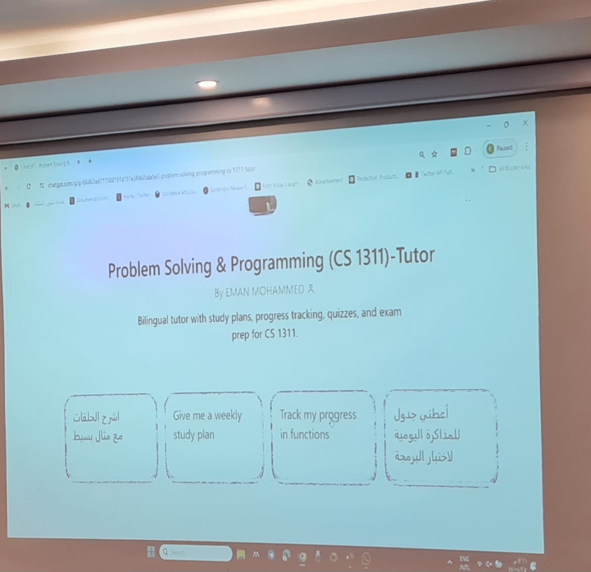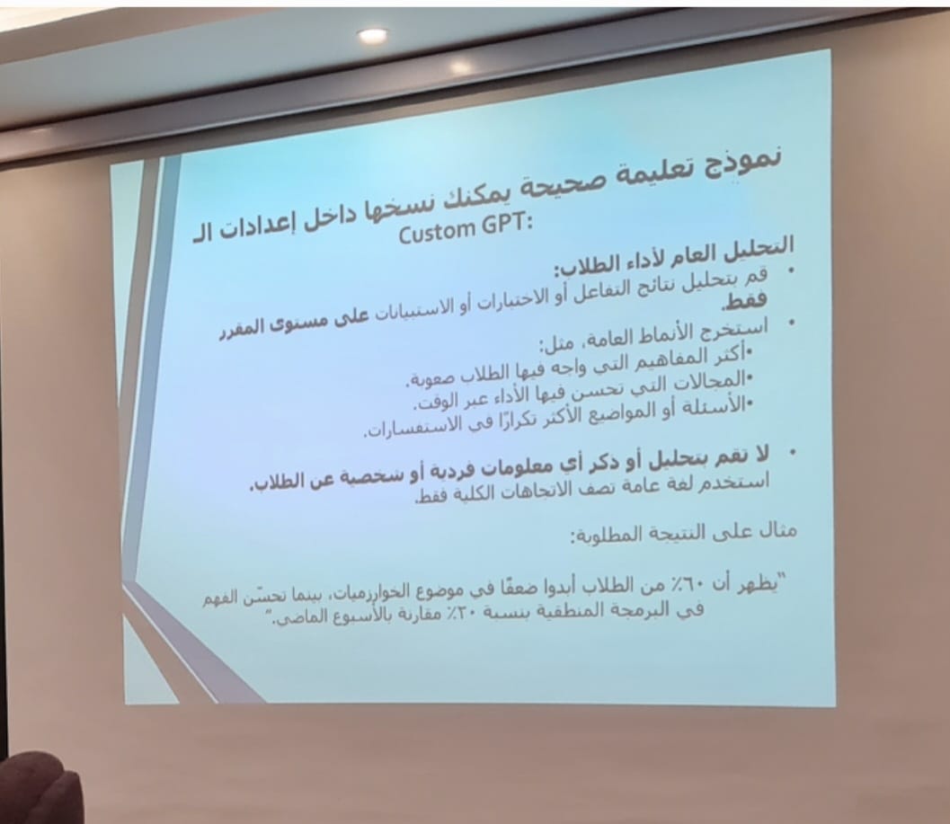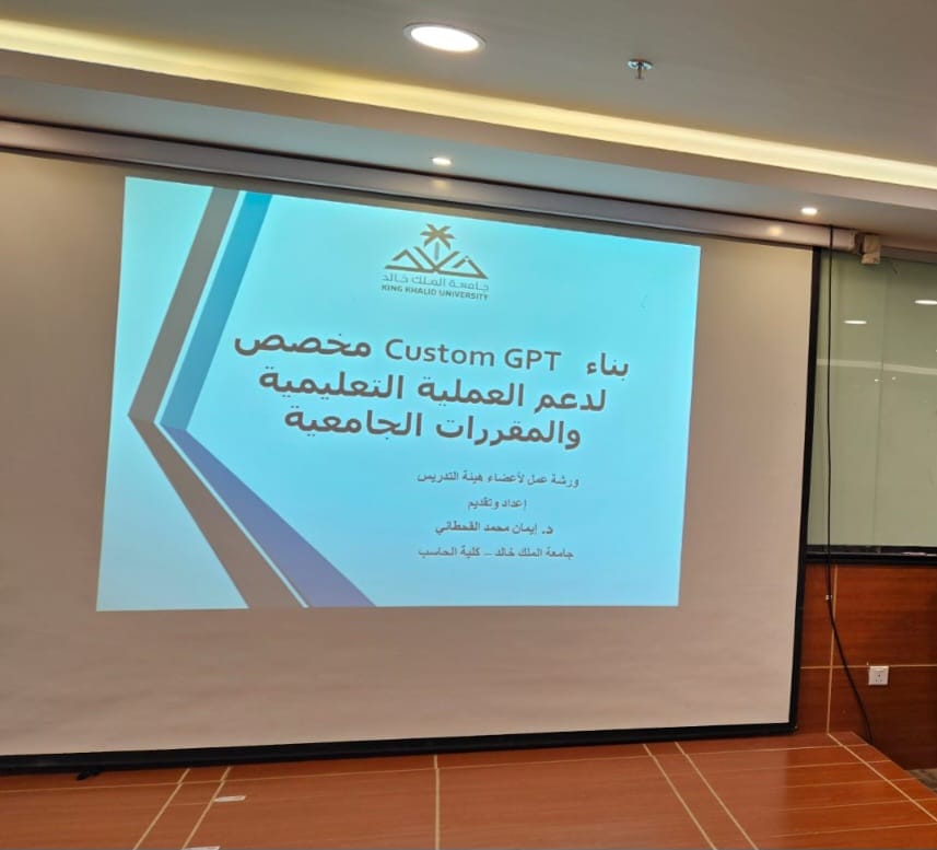 The Student Care and Counseling Unit, in collaboration with the Professional Development Unit, the Department of Community and Mental Health Nursing, and in partnership with the Scientific Research Unit at the College of Computer Science, organized a workshop for faculty members on how to use Artificial Intelligence in the educational process, with a special focus on Custom GPT in course design and preparation.